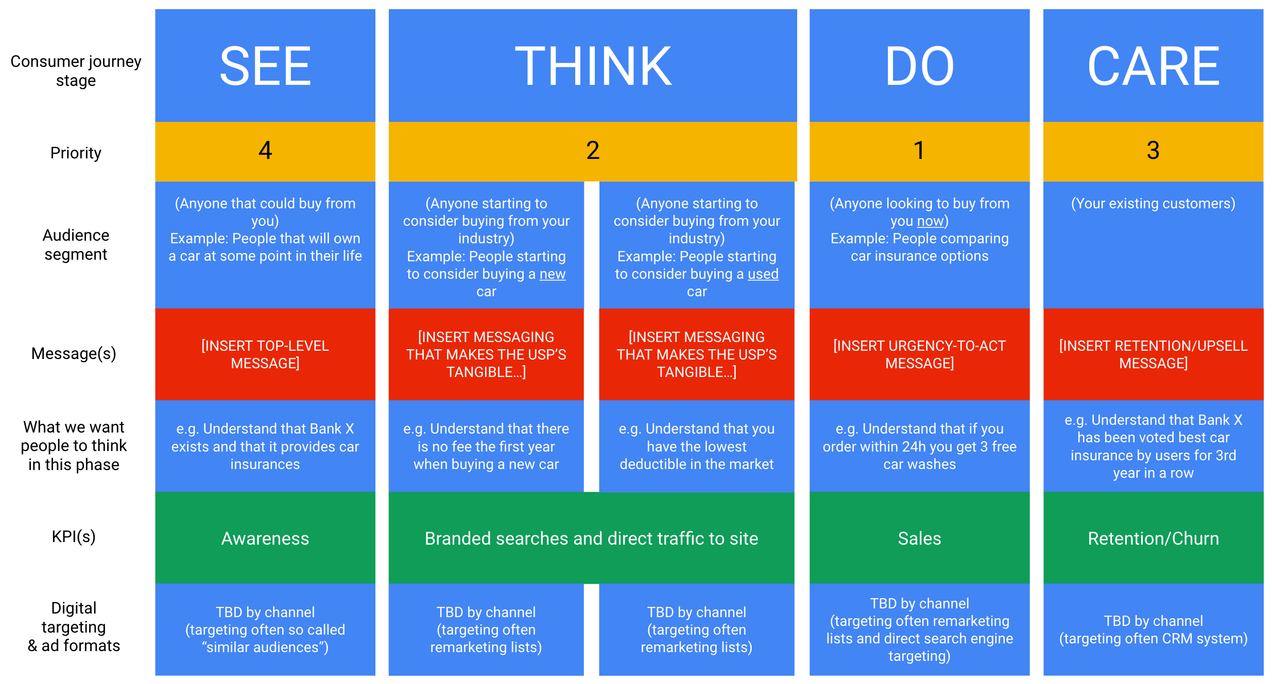 3) Create a “programmatic map” where you gather your audience segments in an overview and outline the key components for each audience segment (see below using the four audience segments See, Think, Do and Care as examples, and also breaking down the Think segment into two sub-segments, one for new car buyers and one for used car buyers)